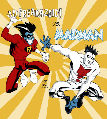 Um encontro não tão inusitado assim. De um lado, o malucão Freakazoid criado por Steven Spielberg e pela Warner Bros. para uma série animada de TV e executado pelo brilhante Bruce Timm, e do outro lado, Madman, o personagem de histórias em quadrinhos criado por Mike Allred, que se inspirou em Frank Sinatra, Albert Einsten e... no próprio Frankestein para criá-lo! Que, por sua vez, acabou se tornando forte inspiração para o desenho animado: Freakazoid!